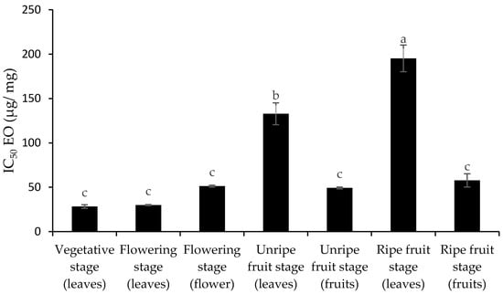 These values were statistically comparable to those found in the leaves during the vegetative stage. Although fruits contained significant amounts of both compounds, the lowest content was found in leaves at the ripe fruit stage, with only 13.39 mg GAE/g for total phenols and 2.23 mg QE/g for flavonoids (Figure 5). Our results indicate that the levels of these compounds are higher in young leaves and decrease with age, with a greater accumulation occurring in the fruits. Figure 6 and Figure 7 show that the antioxidant activity of leaf extracts and EOs was lowest at the ripe fruit stage, as indicated by higher IC50 values, as the plant shifts its resources towards fruit ripening. Conversely, leaves during the vegetative stage exhibited the greatest antioxidant activity as they play a key role in defending against oxidative stress during the plant’s growth phase.