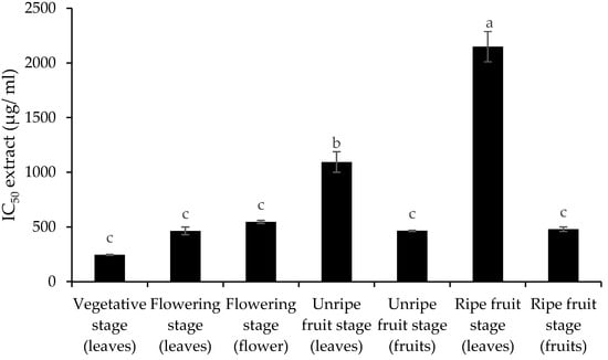 Changes in IC50 extract of C. spinosa organs at different phenological stages. Means (columns) and standard errors (vertical bars) of three replicates are depicted. Columns with different letters were significantly different at p < 0.05 (Duncan’s test).