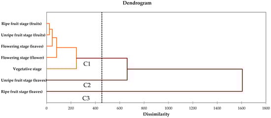 Cluster analysis was carried out to monitor the differences and similarities between the different phenological stages and different organs to determine their effect on the phytochemical composition and antioxidant activity of different parts in C. spinosa. The results of the cluster analysis showed that the four harvesting stages in eight organs could be divided into three different groups (G1, G2, G3), each identified by the similarity of their phytochemical composition. Based on the dendrogram obtained from the cluster analysis, it was observed that the vegetative stage, the flowering stage (leaves), the flowering stage (flowers), the unripe fruit stage (fruits), and the ripe fruit stage (fruits) were classified in the same group (G1), while the unripe fruit stage (leaves) was classified in group 2 (G2) and the ripe fruit stage (leaves) (Figure 8). The importance of cluster analysis goes beyond simple grouping to determine the relative distance between groups. Groups separated by short distances in this study suggest that the quality and quantity of the active compounds are largely similar. Conversely, in groups separated by greater distances, this similarity is low, indicating significant differences in the types and amounts of compounds.