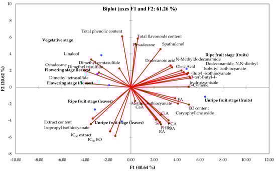 Principal component analysis (PCA) was performed to visualize the relationships between different plant organs at different phenological stages and their associated phytochemical compositions (Figure 9). The analysis showed that the first principal component (PC1) explained 40.64% of the total variance, while the second principal component (PC2) accounted for 20.62%, together explaining 61.26% of the cumulative variance. The PCA biplot showed distinct clustering patterns based on plant organs and developmental stages. Upper right quadrant (positive PC1, positive PC2): ripe fruits were characterized by elevated concentrations of total flavonoids, p-cymene, 3-tert-butyl-4-hydroxyanisole, butyl isothiocyanate, oleic acid, α-cadinol, isobutyl isothiocyanate, dodecanoic acid, N-methyldodecanamide, hexadecane, and spathulenol. Upper left quadrant (negative PC1, positive PC2): vegetative stage tissues, flowering stage leaves, and flowers clustered together, showing strong associations with total phenolic content, linalool, and sulphur compounds including dimethyl trisulphide, dimethyl tetrasulphide, dimethyl pentasulphide, and octadecane. Lower right quadrant (positive PC1, negative PC2): unripe fruits had higher concentrations of EOs, methyl isothiocyanate, caryophyllene oxide, and several phenolic acids including ferulic acid (FA), cinnamic acid (CiA), p-coumaric acid (PCA), rosmarinic acid (RA), vanillic acid (VA), syringic acid (SA), caffeic acid (CaA), and p-hydroxybenzoic acid (PHBA). Lower left quadrant (negative PC1, negative PC2): leaves from both ripe and immature fruit stages were associated with higher extract, isopropyl isothiocyanate, and stronger antioxidant activity as indicated by lower IC50 values for both the extract and EOs. This distinct clustering pattern demonstrates how phytochemical profiles change significantly between different plant organs and developmental stages, providing valuable insights for optimizing harvest timing.