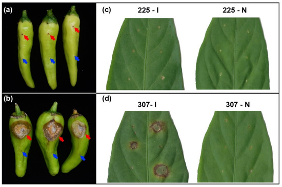 Phenotype after inoculation with Colletotrichum scovillei and needling treatment in resistant variety 225 and susceptible variety 307. (a) Phenotype of fruits of variety 225 after inoculation with C. scovillei (top, red arrow) and needling (bottom, blue arrow) treatment. (b) Phenotype of fruits of variety 307 after inoculation with C. scovillei (top, red arrow) and needling (bottom, blue arrow) treatment. (c) Phenotype of leaves from variety 225 after inoculation with C. scovillei (225–I) and needling (225–N) treatment. (d) Phenotype of leaves from variety 307 after inoculation with C. scovillei (307–I) and needling (307–N) treatment.