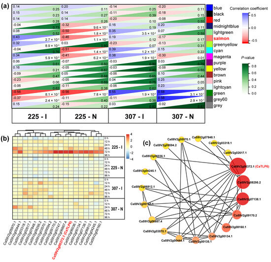 Identification of hub genes related to C. scovillei infection in pepper. (a) Correlation analysis between modules and traits using Pearson’s correlation coefficient. The co-expression modules are represented in different colors. Numbers to the left of each box indicate the correlation values, and numbers to the right represent the p-values. (b) Heatmap of TPM values of 18 hub genes from the salmon module at different time points after various treatments. (c) Co-expression network of the 18 hub genes from the salmon module. The redder color indicates higher connectivity. 225–I: variety 225 after inoculation with C. scovillei; 225–N: variety 225 after needling; 307–I: variety 307 after inoculation with C. scovillei; 307–N: variety 307 after needling.