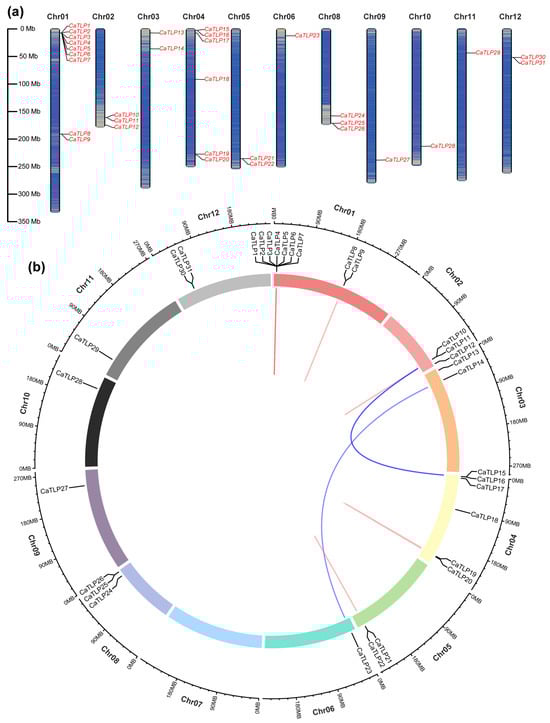 Distribution of TLP genes on Capsicum annuum chromosomes. (a) Distribution of 31 CaTLP genes on 12 chromosomes. The scale represents megabases (Mb). The chromosome numbers (Chr01–Chr12) are indicated above each vertical bar. (b) Distribution of segmental and tandem duplicated TLP genes in the C. annuum genome. Segmental duplications are connected by blue lines, while tandem duplications are indicated by red lines.