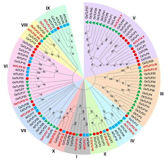 Phylogenetic analysis of TLPs. CaTLPs (red circles) represent Capsicum annuum TLPs; AtTLPs (blue squares) represent Arabidopsis thaliana TLPs; OsTLPs (green triangles) represent Oryza sativa TLPs. The tree was constructed using amino acid sequences by the neighbor-joining (NJ) method, with TLP proteins classified into 10 groups (I to X). Protein names and Roman numerals in red indicate phylogenetic clades as described by Zhao [30].