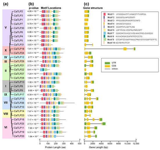 Phylogenetic analysis, conserved motifs, and gene structure of the 31 CaTLPs. (a) Phylogenetic tree of 31 CaTLPs using Geneious. (b) Motif composition and distribution of CaTLPs based on the phylogenetic relationship. Ten different motifs indicated by different colors were identified by MEME. The length of box and line is proportional to protein length. (c) Structure of the 31 CaTLP genes from the TBtools. UTRs and CDSs are indicted by green and yellow boxes, respectively, and introns are shown as black lines. The length of box and line is proportional to gene length.