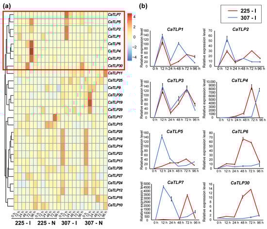 We then tested the expression levels of Group V CaTLPs using qRT–PCR to validate the RNA-seq results. The expression trends obtained from qRT–PCR were consistent with those from RNA-seq, supporting the reliability of our transcriptomic data (Figure 6b). The expression patterns of CaTLP1, CaTLP2, and CaTLP3 were similar in both cultivars, being rapidly induced 12 h after inoculation and fluctuating thereafter. In variety 225, all eight CaTLPs were up-regulated to varying extents. Specifically, CaTLP1 and CaTLP6 had the highest expression levels at 12 h and 48 h post-inoculation, respectively, while CaTLP2, CaTLP3, CaTLP4, CaTLP5, CaTLP7, and CaTLP30 peaked at 72 h post-inoculation. In variety 307, CaTLP6 and CaTLP30 were not significantly induced, while CaTLP1, CaTLP2, CaTLP3, CaTLP5, and CaTLP7 peaked at 12 h post-inoculation, and CaTLP4 was activated at 96 h post-inoculation. The peak of CaTLPs expression in variety 307 mainly appeared in the early stage (12 h after inoculation), while that in variety 225 mainly appeared in the late stage (72 h after inoculation), which may have different effects on the two varieties against fungal diseases.