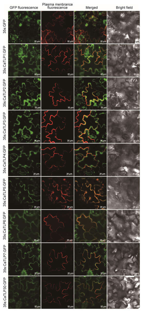 The subcellular localization analysis of the CaTLP1, CaTLP2, CaTLP3, CaTLP4, CaTLP5, CaTLP6, CaTLP7, and CaTLP30 in Nicotiana benthamiana. The transient expression of the 35S::CaTLP–GFP fusing construct and the 35S::GFP construct in N. benthamiana. Green fluorescent protein (GFP) fluorescence was observed using a confocal microscope. Scale bar = 20 μm.