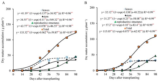 The total dry matter accumulation in the lettuce plants grown for the seed production was continuous throughout the crop cycle and could be divided into two distinct stages: the first from the transplanting to 28 days after the transplanting (DAT), and the second from 29 DAT to the seed harvest (98 DAT), for both the phosphorus doses 800 kg ha−1 of P2O5 (Figure 2A) and 320 kg ha−1 of P2O5 (Figure 2B).