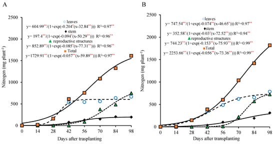 Interestingly, even though the reproductive structures represented only 37% (Figure 2A) and 34% (Figure 2B) of the total dry mass at 98 DAT for the 800 and 320 kg ha−1 doses, respectively, they accounted for a significant proportion of the total nitrogen accumulation, 48% and 41%, respectively.