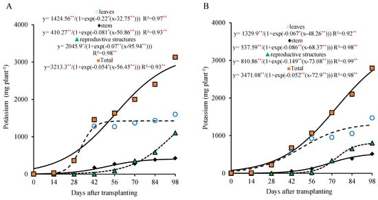 Potassium accumulation in different parts of lettuce plants grown for seed production under organic fertilization with 800 (A) and 320 (B) kg ha−1 of P2O5. (Caption: ** and *, p < 0.01 and p < 0.05 of probability, respectively).