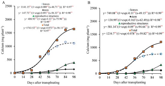 Calcium accumulation in different parts of lettuce plants grown for seed production under organic fertilization with 800 (A) and 320 (B) kg ha−1 of P2O5. (Caption: ** and *, p < 0.01 and p < 0.05 of probability, respectively).