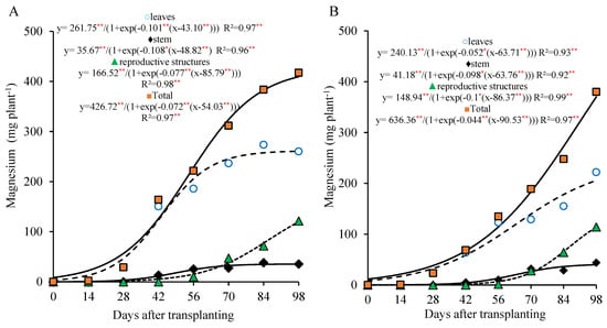 The magnesium accumulation curve for the 800 kg ha−1 P2O5 dose in the leaves and the stem followed a pattern similar to that of the calcium, with more pronounced values in the leaves until 56 DAT and a gradual accumulation in the stem, which reached its maximum at the end of the cycle. In the reproductive part, the magnesium accumulation became more intense after 70 DAT, with approximately 68.2% of the total magnesium in these organs being accumulated after this period. The total magnesium accumulation was slow from the transplanting to 28 DAT, with an average of 1.86 mg plant−1 day−1. From 29 to 98 DAT, the average accumulation rose to 5.14 mg plant−1 day−1, during which about 87.5% of the total magnesium was accumulated. At 98 DAT, the total magnesium accumulation reached 416 mg plant−1, with 63% in the leaves, 9% in the stem, and 29% in the reproductive part (Figure 7A).