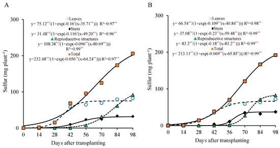 Sulfur accumulation in different parts of lettuce plants grown for seed production under organic fertilization with 800 (A) and 320 (B) kg ha−1 of P2O5. (Caption: ** and *, p < 0.01 and p < 0.05 of probability, respectively).