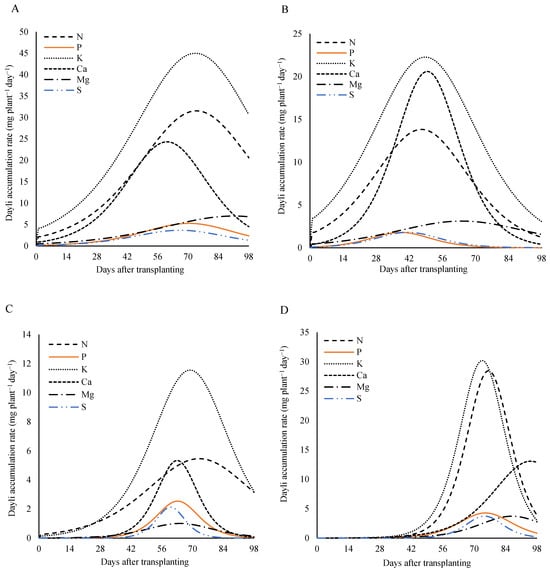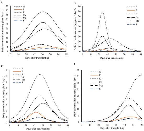 In the leaves, the highest daily accumulation rates for the nitrogen, the phosphorus, and the potassium were 30.8, 4.8, and 78.2 mg plant−1 day−1, respectively, reached at 33 DAT. The calcium reached its peak later, at 25 mg plant−1 day−1 on 50 DAT. The magnesium peaked at 6.6 mg plant−1 day−1 at 44 DAT, and the sulfur had the lowest peak at 3.0 mg plant−1 day−1 at 36 DAT (Figure 9C).