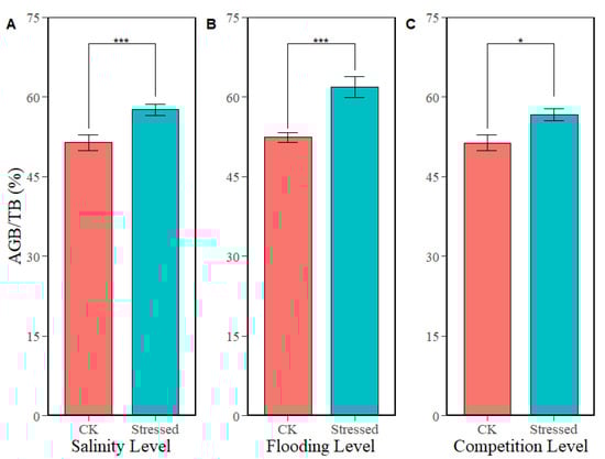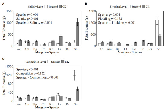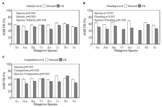 3.2. Effects of Environmental and Biotic Stresses and Their Interactive Effects on Biomass Allocation of Juvenile Mangrove Plants