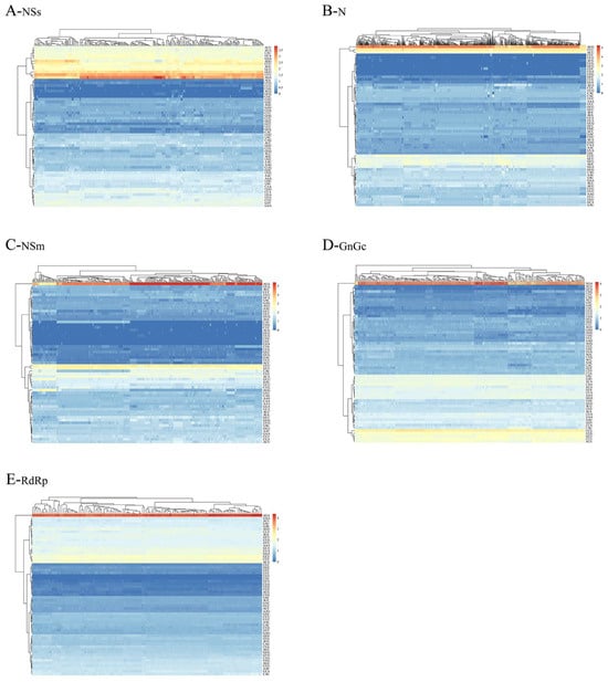 We retrieved available genomic sequences for five TSWV protein-coding regions (GnGc, N, NSm, NSs, RdRp) from GenBank (accessed on 9 July 2024). Sequences were filtered based on length consistency (retaining those within the expected range for each protein) and coding integrity (excluding sequences with internal stop codons or frameshift mutations). The final curated dataset comprised 213 sequences of GnGc, 770 sequences of N, 293 sequences of NSm, 257 sequences of NSs, and 132 sequences of RdRp. Table S1 presents detailed information about the isolates, including accession numbers, geographical locations, collection dates, and host origins.