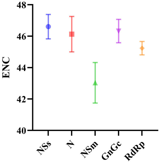 To quantify the CUB in the TSWV genome, we calculated the ENC values. Among the individual protein-coding sequences, NSs exhibited the highest ENC values, while NSm showed the lowest (Figure 2). The average ENC value of the five coding sequences exceeded 40. This finding suggests that the TSWV genome is stable and conserved, characterized by a limited degree of CUB across almost all its protein-coding sequences.