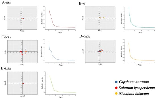 The relative and cumulative inertia of the 40 axes from a PCA of the RSCU values based on protein-coding sequences of TSWV. The C. annuum, S. lycopersicum, and N. tabacum are represented in blue, red, and yellow, respectively.