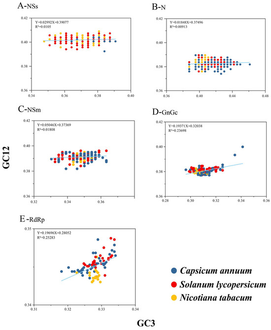 Neutrality plot analysis of TSWV. Use the GC12s of the gene codons as X-axis and the GC3s of the gene codons as Y-axis. A coordinate value of 0.5 on both the abscissa and ordinate signifies equal usage rates of GC12 and GC3. The C. annuum, S. lycopersicum, and N. tabacum are distinguished by blue, red, and yellow, respectively.