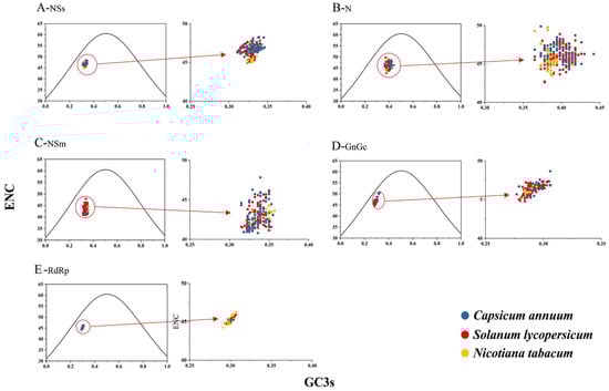 As shown in Figure 5, all TSWV isolates corresponding to different protein-coding sequences and originating from various hosts generally clustered below the expected ENC curve. This clustering pattern suggests that natural selection had a stronger influence on CUB compared to mutation pressure, though mutation pressure still exerted some impact.