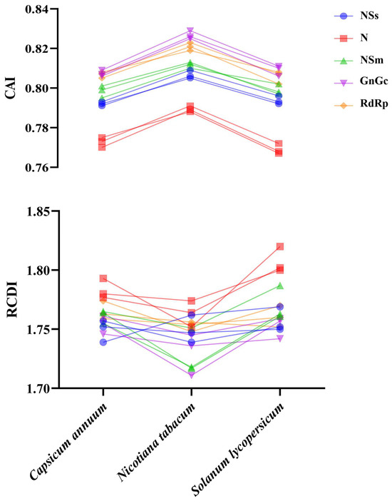 To assess the adaptation and optimization of TSWV’s codon usage toward its hosts, CAI values were calculated. Higher CAI values generally indicate greater host adaptability. Among the five protein-coding sequences analyzed, Nicotiana tabacum exhibited the highest CAI values (Figure 6), signifying the optimal adaptation of TSWV to this host species. Furthermore, an RCDI analysis was also performed to evaluate the cumulative effects of CUB on gene expression. The mean RCDI values were most pronounced in Solanum lycopersicum (Figure 6), suggesting the strongest evidence of codon usage deoptimization in this host.