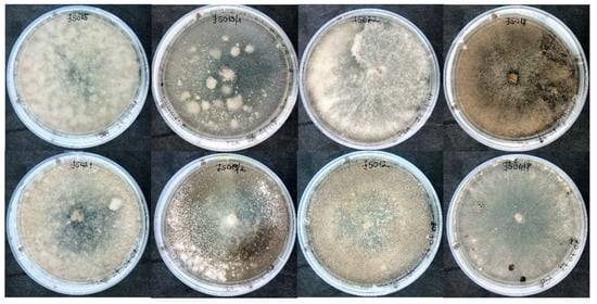 Botrytis isolates, when cultivated on PDA at 20 °C in the dark, exhibited a range of colony morphology characteristics (Figure 3). The majority of the isolates had limited aerial mycelium production; their growth was restricted to the agar surface. Only some of them produced fluffy or cottony structure. The color of the colonies varied between shades of white to gray and brown. The colonies were compact and homogeneous, without radial expansion. Mycelial nodulation was observed in some isolates as a precursor to sclerotia formation. Rapid sclerotia formation was observed in some isolates within 10 days.