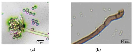 Microscopic examination revealed presence of septate, hyaline hyphae and smooth, globose to subglobose conidia with a diameter ranging from 3 to 6 µm. Conidia were produced in small clusters on branched conidiophores (Figure 4a,b).