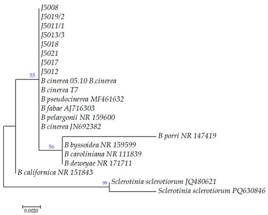 A total 8 out of 37 B. cinerea isolates with different colony morphological characters were chosen for sequence-based identification. Following PCR amplification of the rDNA region, containing ITS1 and ITS2 sequences, eight B. cinerea isolates were sequenced, and the resulting sequences were deposited into GenBank with accession numbers PV290581–PV290588 (Table 3).