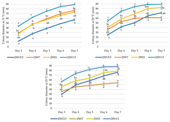 Significant variations in growth rates were observed among strains and across temperature treatments (Figure 6). At 15 °C, clear differences in growth rates were observed among the four Botrytis cinerea isolates. Isolate J5013/3 exhibited the slowest growth, with colony diameters reaching only 57.4 mm after 7 days of incubation. J5017 and J5021 exhibited intermediate growth rates, and J5011/1 was the most vigorous at 15 °C, overgrown the entire medium (90 mm).