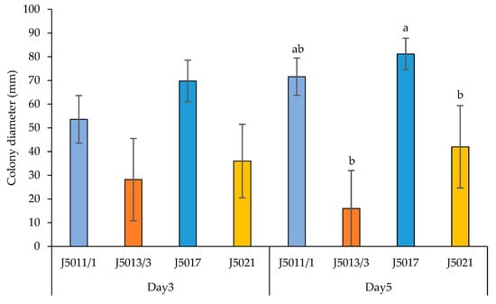 There were no significant differences between the isolates on day 3 of reduced temperature incubation (Kruskal-Wallis test: p > 0.05). However, significant differences in colony diameters were observed among the isolates on day 5 (Kruskal-Wallis test: p < 0.005) (Figure 7).