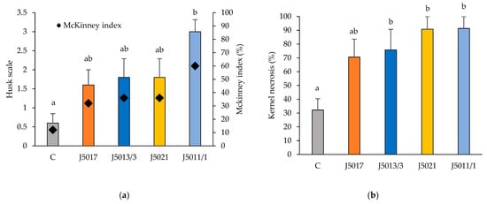 (a) Scale values and McKinney index on husk and (b) percentage of necrosis on walnut kernels at BBCH stage 75 three weeks following inoculation with different Botrytis cinerea isolates (J5017, J5013/3, J5021, J5011/1) and a sterile agar plug (C). CLD (lowercase letters) indicates statistically significant differences based on pairwise Mann-Whitney U tests (p < 0.05).