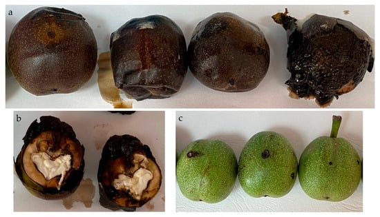 The broad spectrum of symptoms on walnuts; (a) small brown lesion, as an initial symptom; (b) extended necrotic lesion; (c) advanced stage of the disease.