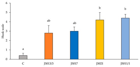 Scale values on mature walnut husk caused by different Botrytis cinerea isolates (J5017, J5013/3, J5021, J5011/1), and sterile agar plug (C). CLD (lowercase letters) indicates statistical differences based on pairwise Mann-Whitney U tests (p < 0.05).