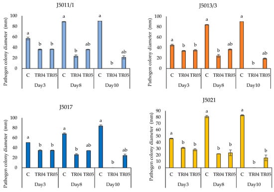 Inhibition of TR04 and TR05 Trichoderma strains against Botrytis cinerea isolates (J5011/1, J5013/3, J5017, J5021), and without antagonist (C). CLD (lowercase letters) indicates statistical differences based on pairwise Mann-Whitney U tests (p < 0.05).