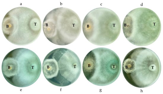 Confrontation test showing the antagonistic activity of Trichoderma (T) strains TR04 (a–d) and TR05 (e–h) against Botrytis cinerea (B) J5011/1 (a,e), J5013/3 (b,f), J5017 (c,g), J5021 (d,h) eight days after inoculation.