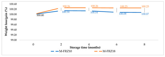 The weight loss trend for the ‘Mejhoul’ cultivar is presented in Figure 2 for the two freezing temperatures. It was found that this analytical parameter did not change for date fruit samples stored at 10 °C (M-FRZ10) and −18 °C (M-FRZ18) since, after eight months of frozen storage, the rates of weight gain were, respectively, 0.07% and 0.25%.