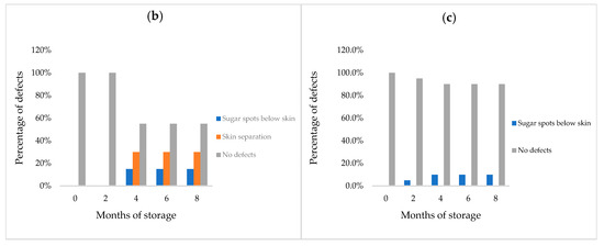 Illustration of “skin separation” and “sugar crystallization below the epidermis” for ‘Mejhoul’ stored at −18 °C (a), and the incidence of physical defects during ‘Mejhoul’ frozen storage at −18 °C (b) and −10 °C (c) (measurements for 100 fruits).