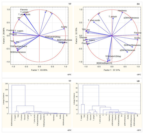 Multivariate analysis of data obtained for frozen ‘Mejhoul’: principal component analysis of frozen ‘Mejhoul stored at −10 °C (a) and −18 °C (b); hierarchical cluster for frozen ‘Mejhoul stored at −10 °C (c) and −18 °C (d).