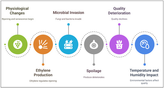 Postharvest spoilage in fresh produce is a multifaceted process influenced by both physiological changes and microbial activity [19,20]. Following harvest, produce undergoes a series of natural processes, including ripening, senescence, and biochemical transformations, which significantly impact the quality and shelf life. These changes are further complicated by the presence of microorganisms that cause decay, wilting, and the degradation of essential nutrients. Current conventional preservation methods, such as cold storage, modified atmosphere packaging (MAP), and ethylene inhibitors, while effective to some extent, have limitations. Cold storage, for example, can lead to chilling injuries in certain crops, resulting in discoloration and reduced quality. Studies have shown that cold storage at controlled freezing points (e.g., −1 °C) can reduce chilling injury compared with conventional cold storage at 4 °C, preserving the quality of crops like sweet corn [21]. Modified atmosphere packaging has also been widely used to extend shelf life and preserve the quality of various fruits. It is particularly effective for blueberries, where MAP at 0 °C helped reduce weight loss and maintain the appearance and texture during storage [22]. Similarly, MAP has been proven to extend the shelf life of fruits like passion fruit, reducing ethylene production and slowing down the ripening process. Finally, ethylene inhibitors such as 1-MCP and AVG are widely used to delay fruit ripening. These inhibitors have been shown to reduce fruit softening, maintain firmness, and prevent decay in avocados [23]. However, despite their benefits, these methods cannot completely halt quality deterioration, particularly in highly sensitive fruits. Therefore, while these preservation methods offer some benefits, they each have their limitations, requiring continuous research and improvement. Understanding the interplay between physiological processes and microbial growth is essential for developing strategies to extend the shelf life of perishable crops [24,25]. The processes of spoilage and quality deterioration, including microbial involvement (e.g., fungi and bacteria) and physiological changes such as ethylene production and senescence, are illustrated in Figure 1, which provides a visual representation of these contributing factors.