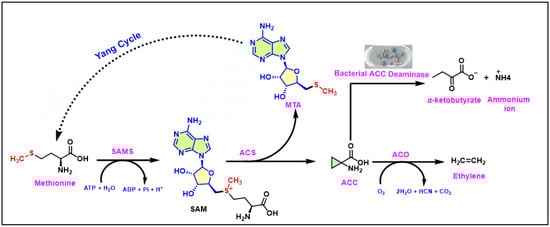 Structural representation of the ethylene biosynthesis pathway and role of ACC deaminase producing bacteria.