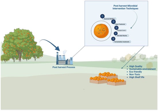 The promising results of certain microbial antagonists in laboratory studies conducted in packing houses have sparked significant interest among agrochemical companies for the development and commercialization of bioproducts aimed at controlling postharvest diseases in fruits and vegetables. These biocontrol agents, typically derived from naturally occurring microorganisms, provide an environmentally friendly alternative to chemical fungicides. As concerns over pesticide residues and environmental sustainability grow, microbial antagonists offer a viable solution for reducing the reliance on synthetic chemicals in postharvest management [111]. The success of these agents in controlled environments has led to their incorporation into commercial products, with notable examples including YieldPlus (USA), BIOSAVE-110 (The Netherlands), SMARTBLOCK (USA), T-22 (USA), BioProtect (USA), and BioTelo (Spain). These bioproducts have been successfully employed worldwide to manage a wide range of postharvest pathogens such as Botrytis cinerea, Penicillium spp., and Rhizopus spp. By effectively controlling these pathogens, they help extend the shelf life and improve the quality of fresh produce. Moreover, these microbial agents contribute to integrated pest management strategies, promoting sustainable agricultural practices. The widespread adoption of bioproducts like ASPIRE and BIOSAVE-110 highlights the growing recognition of microbial antagonists as a key element in postharvest disease control. This shift toward natural solutions not only reduces spoilage, but also offers a basis for microbial interventions as a sustainable and effective strategy for controlling postharvest diseases and is recognized as a more eco-friendly and sustainable approach to managing postharvest diseases, aligning with the global trend toward greener agricultural practices (Figure 4).