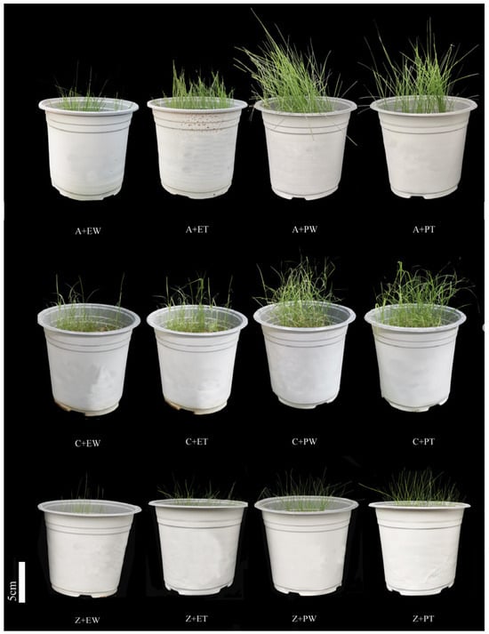 Effects of different treatments on the growth of three turfgrass species. Abbreviations: A—A. compressus, C—C. dactylon, Z—Z. sinica, EW—eco-concrete–water, ET—eco-concrete–T. harzianum, PW—pastoral soil–water, PT—pastoral soil–T. harzianum. Scale = 5 cm.