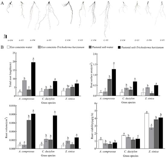 Effects of different treatments on root morphology and development of three turfgrass species. (A) The root morphology of plants. Abbreviations: A—A. compressus, C—C. dactylon, Z—Z. sinica, EW—eco-concrete–water, ET—eco-concrete–T. harzianum, PW—pastoral soil–water, PT—pastoral soil–T. harzianum. Scale = 1 cm. (B) The total root length, root surface area, root volume, and root viability of three turfgrass species under different treatments. The data are presented as the means ± SEs (n = 5); different letters above the bars indicate significant (p < 0.05) differences.