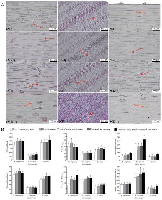 Anatomy of the leaf epidermis of three turfgrass species. (A) Lower epidermal structure of the leaves under a light microscope. Abbreviations: A—A. compressus, C—C. dactylon, Z—Z. sinica, EW—eco-concrete–water, ET—eco-concrete–T. harzianum, PW—pastoral soil–water, PT—pastoral soil–T. harzianum. (B) Parameters (length, width, and density) related to lower epidermal cells and stomata. The data are presented as the means ± SEs (n = 30); different letters above the bars indicate significant (p < 0.05) differences.