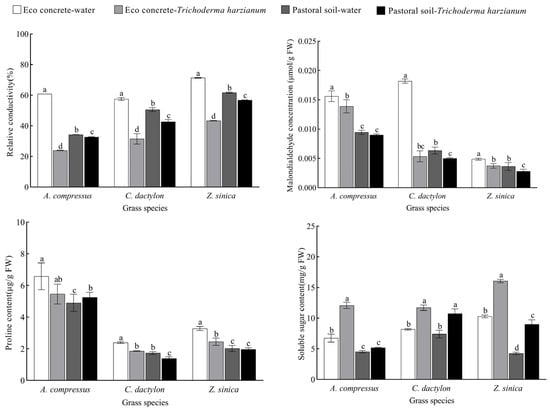 Effects of different treatments on cell membrane permeability and osmoregulatory substances in three turfgrass species. The data are presented as the means ± SEs (n = 3); different letters above the bars indicate significant (p < 0.05) differences.