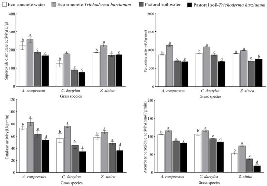 The application of T. harzianum significantly influenced the antioxidant enzyme activities of three turfgrass species (Figure 5). To assess the physiological impact of T. harzianum, we measured the activities of key antioxidant enzymes—superoxide dismutase (SOD), peroxidase (POD), catalase (CAT), and ascorbate peroxidase (APX). The results demonstrated that turfgrasses cultivated in eco-concrete exhibited substantially higher SOD, POD, CAT, and APX activities compared to those grown in pastoral soil; further increases in antioxidant enzyme activities were observed after inoculation with T. harzianum. In contrast, no consistent trend was observed in the antioxidant enzyme activities of turfgrasses inoculated with T. harzianum in pastoral soil. All antioxidant enzyme activities showed a decreasing trend, except those of SOD and POD, which increased in Z. sinica.