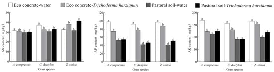 The application of T. harzianum significantly altered the available nitrogen (AN), available phosphorus (AP), and available potassium (AK) contents in turfgrasses cultivation systems (Figure 6). Under unstressed conditions, T. harzianum inoculation increased AN, AP, and AK levels compared to the non-inoculated control. Similarly, soil amendment with cement enhanced these nutrient contents across the three turfgrass species. However, in the eco-concrete system, T. harzianum treatment resulted in varying degrees AN, AP, and AK content reduction.