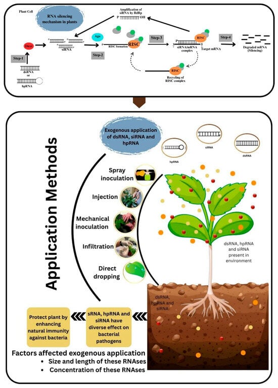 - Dalakouras, A.; Wassenegger, M.; Dadami, E.; Ganopoulos, I.; Pappas, M.L.; Papadopoulou, K. Genetically Modified Organism-Free RNA Interference: Exogenous Application of RNA Molecules in Plants. Plant Physiol. 2020, 182, 38–50. [Google Scholar] [CrossRef]