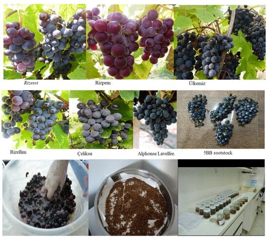 This study employed seeds from five Vitis labrusca L. cultivars (‘Rizessi’, ‘Rizpem’, ‘Ülkemiz’, ‘Çeliksu’, and ‘Rizellim’) registered in 2016 [7], one Vitis vinifera L. cultivar (‘Alphonse Lavallèe’), and the 5 BB rootstock (V. berlandieri × V. riparia) (Figure 1).