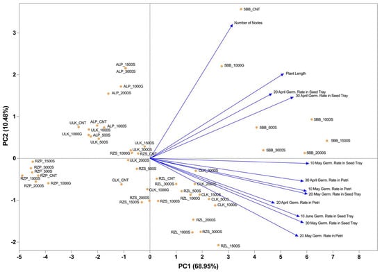 When the presented PCA graph is analyzed, significant insights are obtained regarding the relationships between various cultivars and measured parameters. PC1 explains 68.95% of the variance, while PC2 accounts for 10.48%, together representing approximately 79.43% of the total variance. A strong positive correlation was observed between the parameters of plant length and the number of nodes. These two parameters also showed a positive relationship with the 5BB rootstock. Notably, the 5BB_CNT sample exhibited the strongest positive correlation with the number of nodes. Regarding germination rates, positive correlations were identified between the germination rates measured at different dates in Petri dishes and seed trays. Germination rates from seed trays on 20 April, 30 April, and 10 May were positively correlated with each other. Similarly, germination rates in Petri dishes on 20 April, 30 April, and 10 May also showed positive intercorrelations. The RZL cultivars, particularly RZL_1500S and RZL_2000S, were positively associated with late-stage germination parameters (20 May and 30 May). In contrast, the RZP cultivars clustered on the negative side of PC1 and showed weak associations with germination parameters. ALP cultivars, especially ALP_3500S and ALP_1000G, were located on the positive side of PC2 but did not exhibit a distinct relationship with germination parameters. ULK cultivars were generally distributed near the center of the plot.